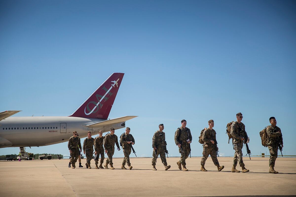 U.S. Marines deplane a Boeing 777 at the Royal Australian Air Force base for the upcoming Marine Rotational Force – Darwin in Darwin, Australia, April 12. (Staff Sgt. Jordan E. Gilbert/Marine Corps)