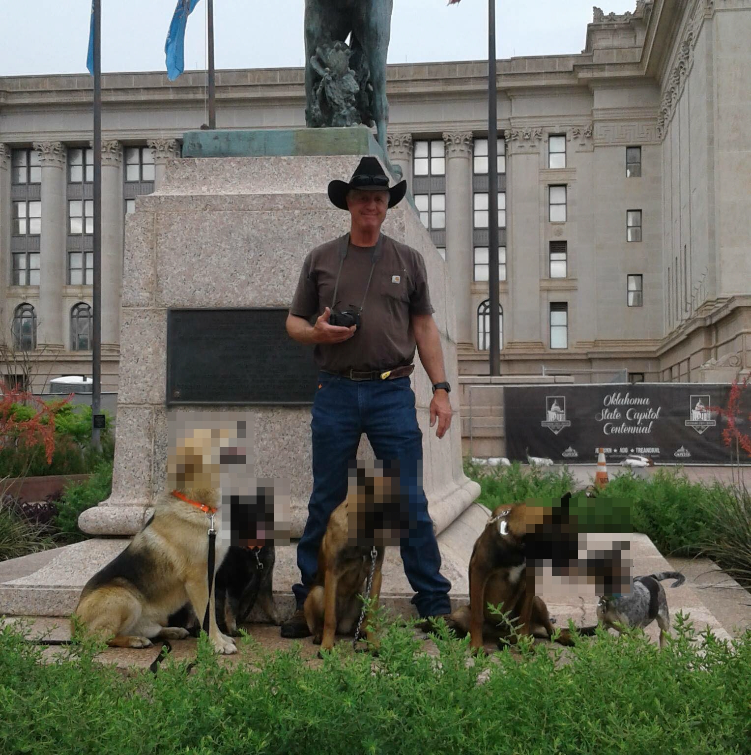 Good thing that someone pixalated out the faces of those poor dogs that posed with him… saved them the trauma of being called out by the cats that run the Interwebs.