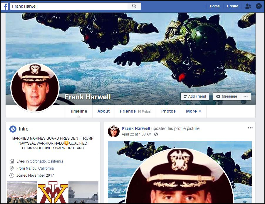 The folks at Military Phony send us their work on “Frank Justin Harwell” who lives in Odessa, TX but claims he lives in Coronado, CA. Frank has used the nickname “Frankie” as well as “Donkey Dick Donaldson.”