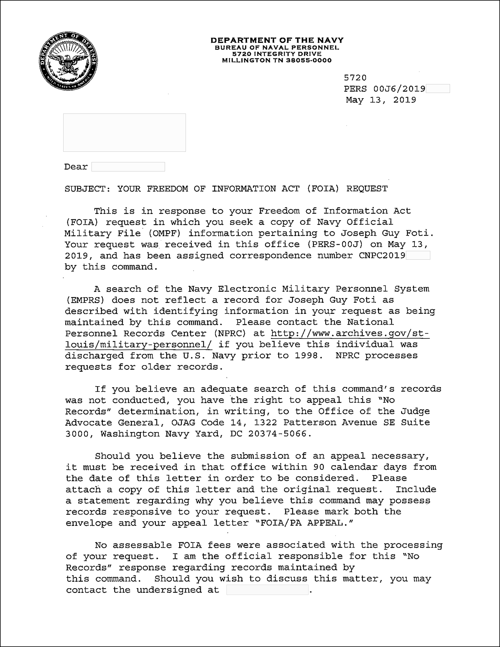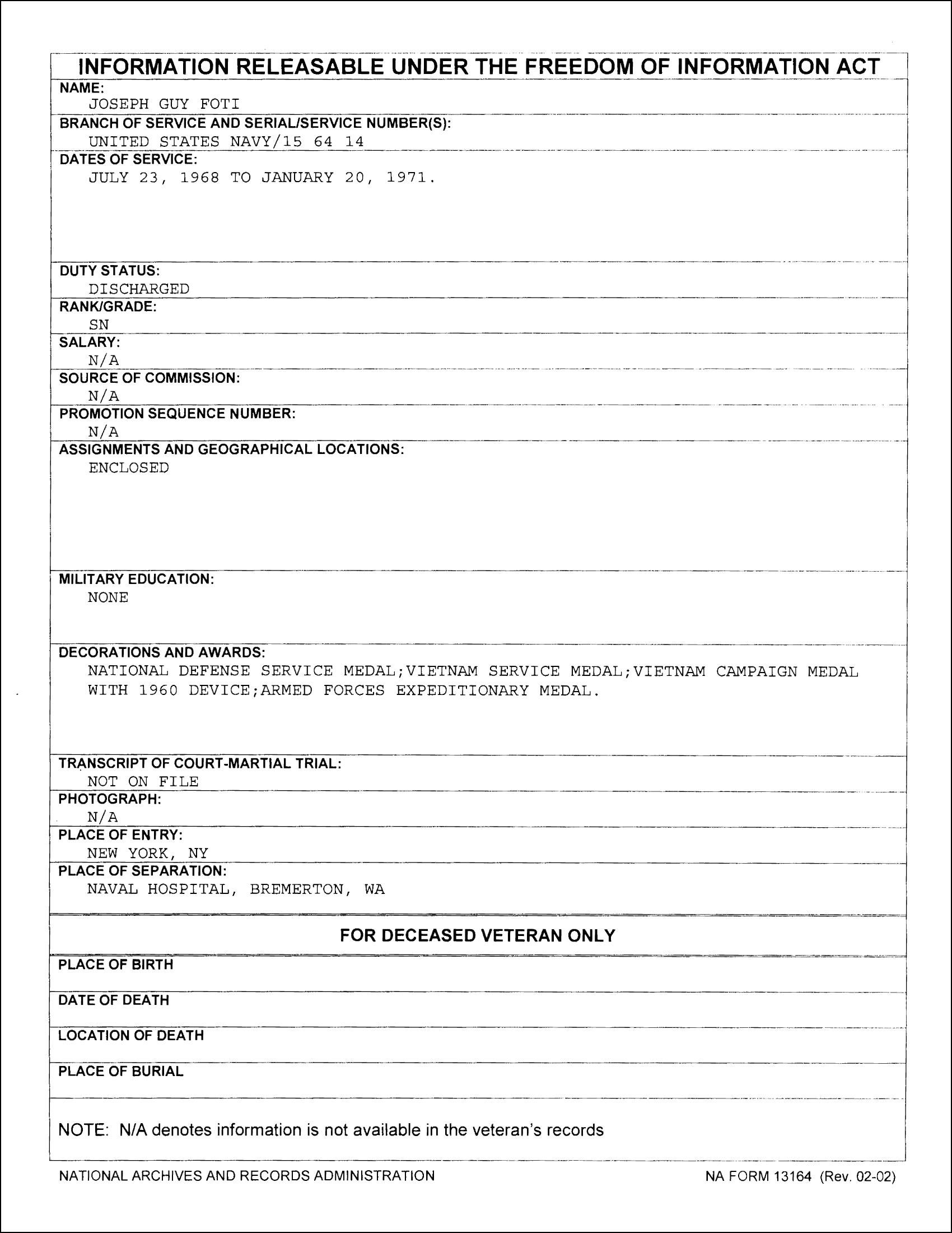 A SEAL at Military Phony checked the SEAL-BUD/S database and determined that Joseph Foti was not listed. Foti claimed to be retired, so his records were ordered through both DoN and NPRC.