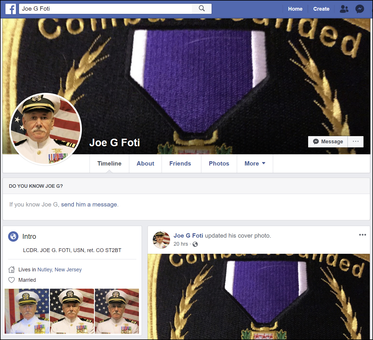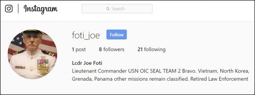 The folks at Military Phony sent us their work on Joseph Guy Foti, who claims he retired from the Navy as a Navy SEAL and earned the Silver Star, Bronze Star Medal with “V,” the Purple Heart and a Combat Action Ribbon with a star denoting a second award.