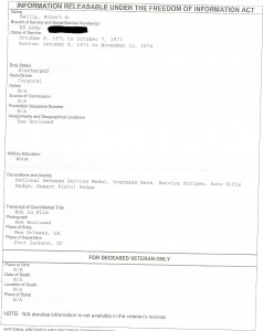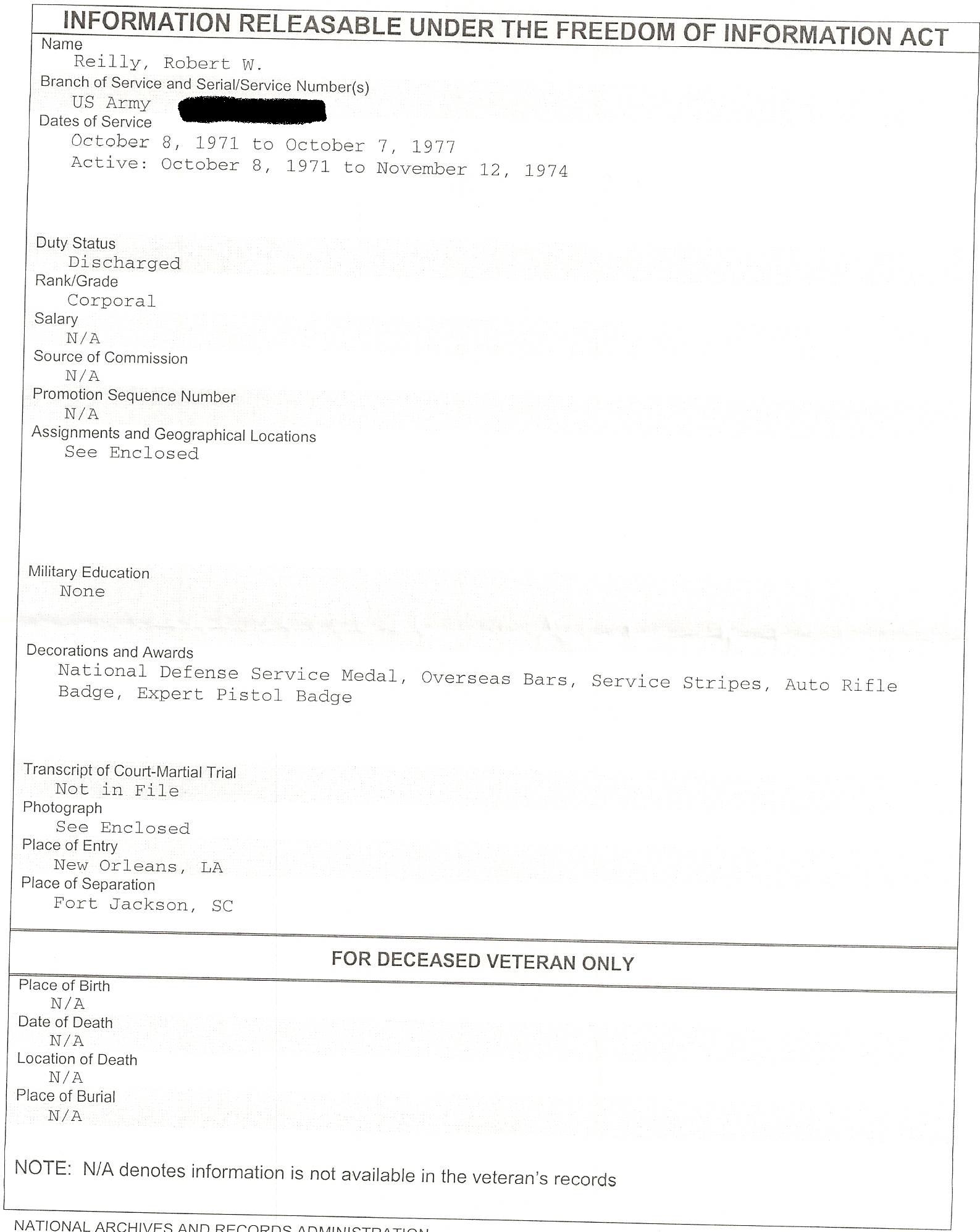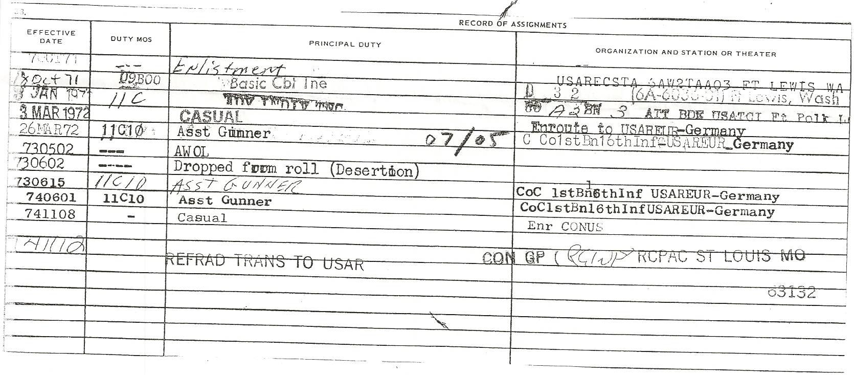 See, if you didn’t already know that Reilly wasn’t a Vietnam Vet, from reading that paragraph, you’d get the impression that he did serve in Vietnam. Also, in that paragraph, he said that he “payed [sic] dearly for [his] stand” against the Vietnam War. I wondered about that, too. His “stand” was actually four weeks of being AWOL and being declared a deserter for a few weeks in May and June of 1973 (Spring time in Bavaria). The war in Vietnam was essentially over, US combat troops were all withdrawn in August of 1972 – so why’d he desert? Oh, yeah, here’s the Form 2-1;