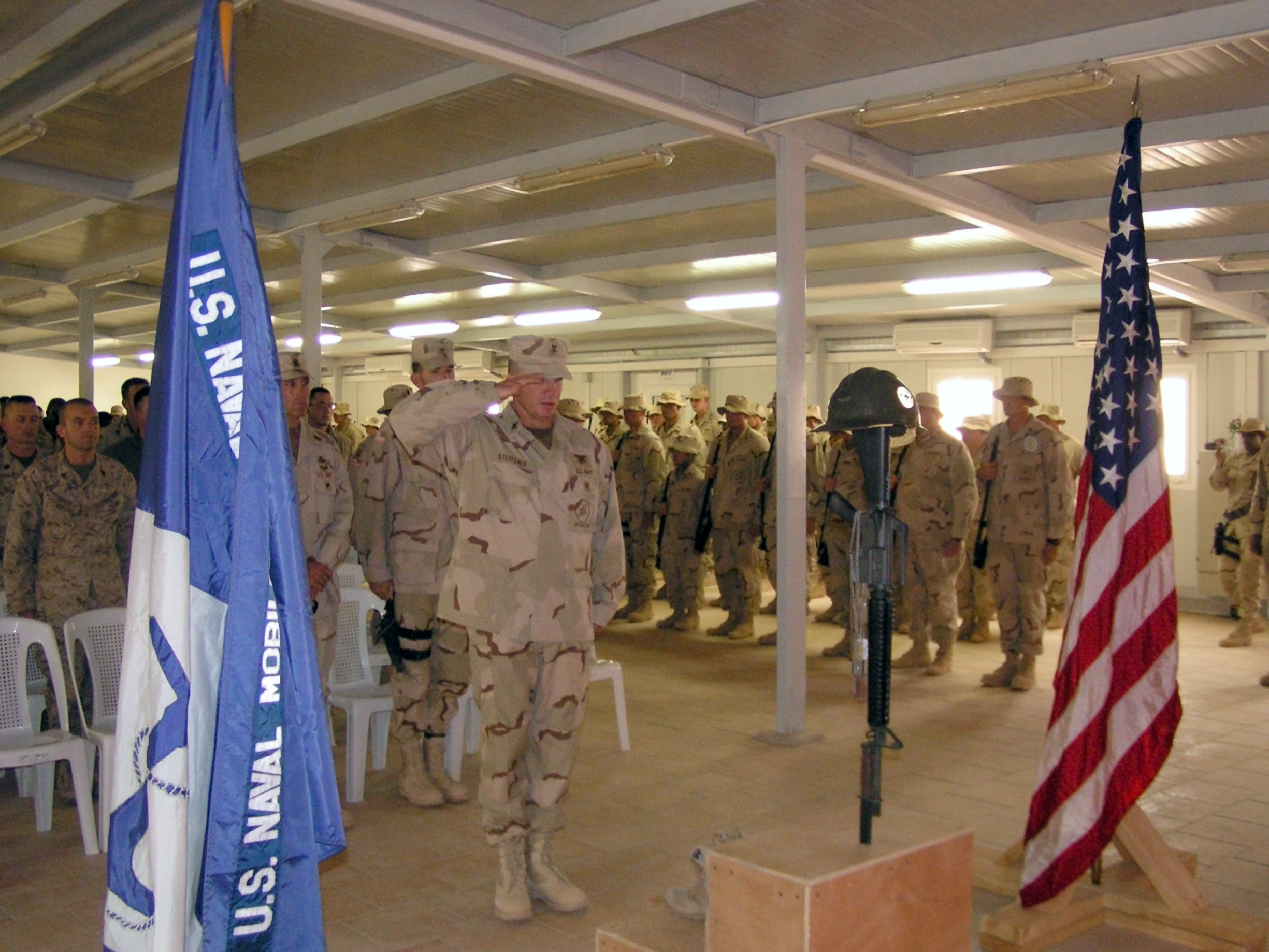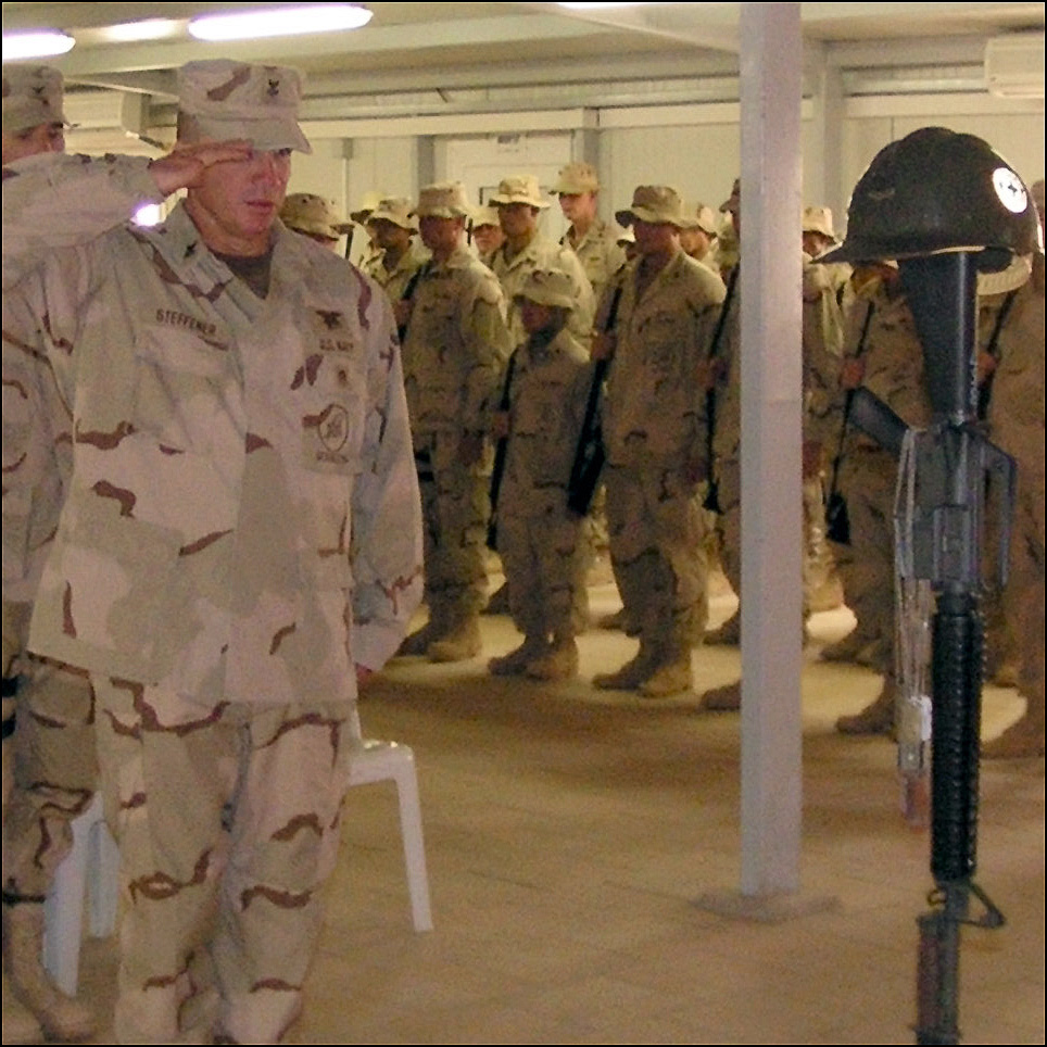 Iraq (May 15, 2004) – U.S. Navy Seabee, Construction Mechanic 1st Class Mark Steffner pays his final respects with a salute to his seven fallen shipmates at a memorial ceremony in Iraq. Naval Mobile Construction Battalion One Four (NMCB-14) lost seven members of its battalion in two separate encounters with Anti-Coalition Forces in Iraq within a 72-hour period. NMCB-14 is a Naval Reserve Seabee Battalion headquartered in Jacksonville, Fla. U.S. Navy photo by Ens. Tony Hollobaugh (RELEASED)