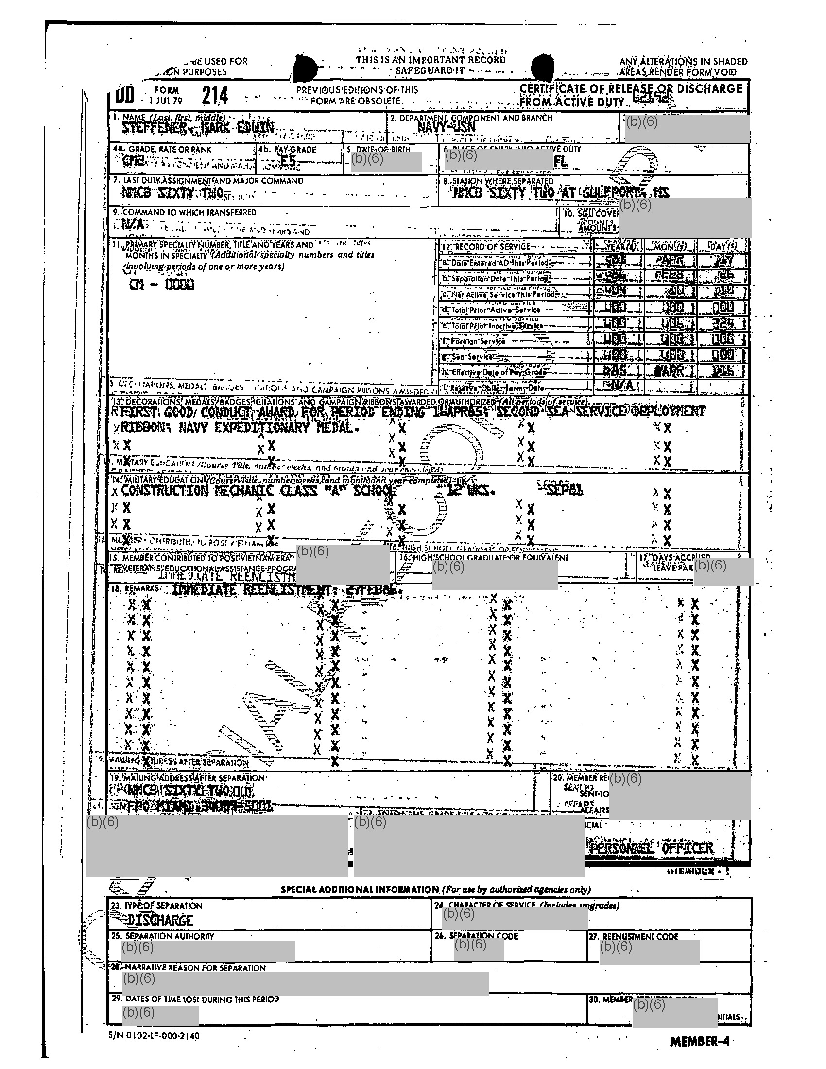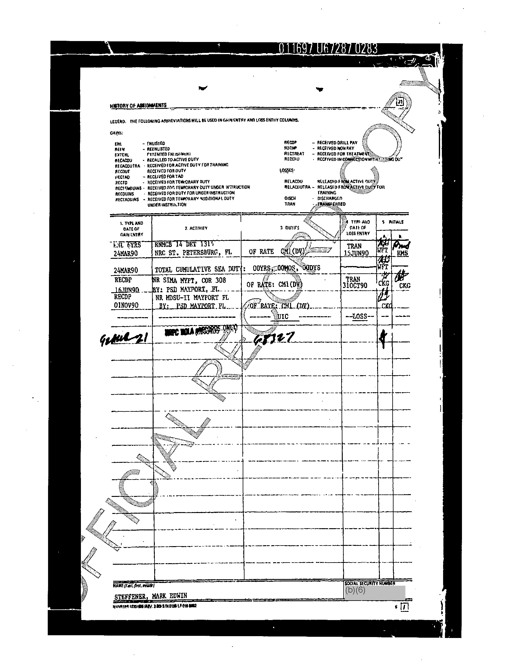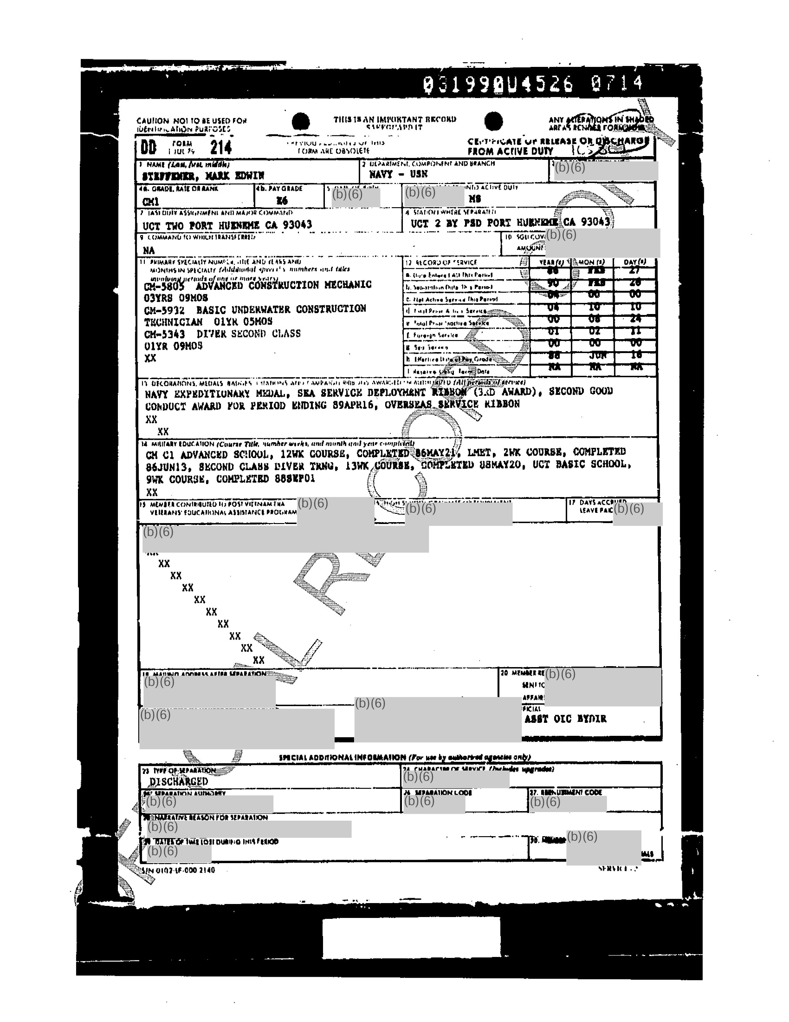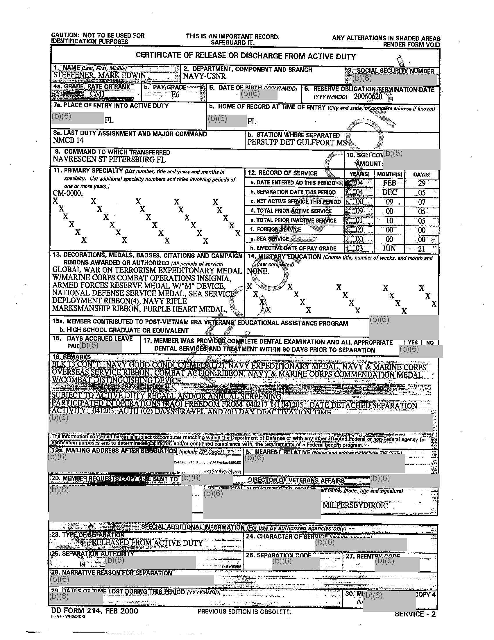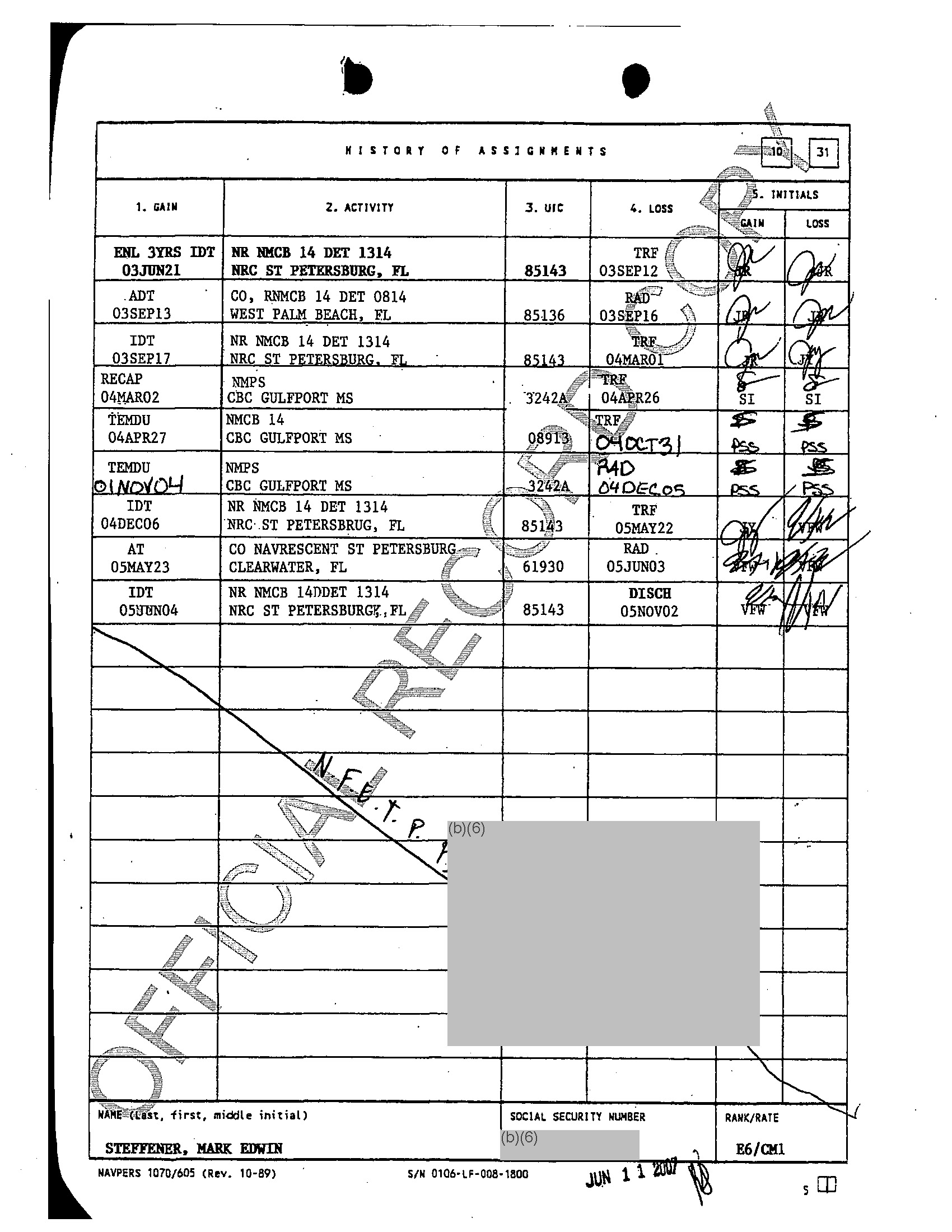 It was determined that Steffener was not on the BUD/S-SEAL database so his official military records were ordered through the Department of the Navy.