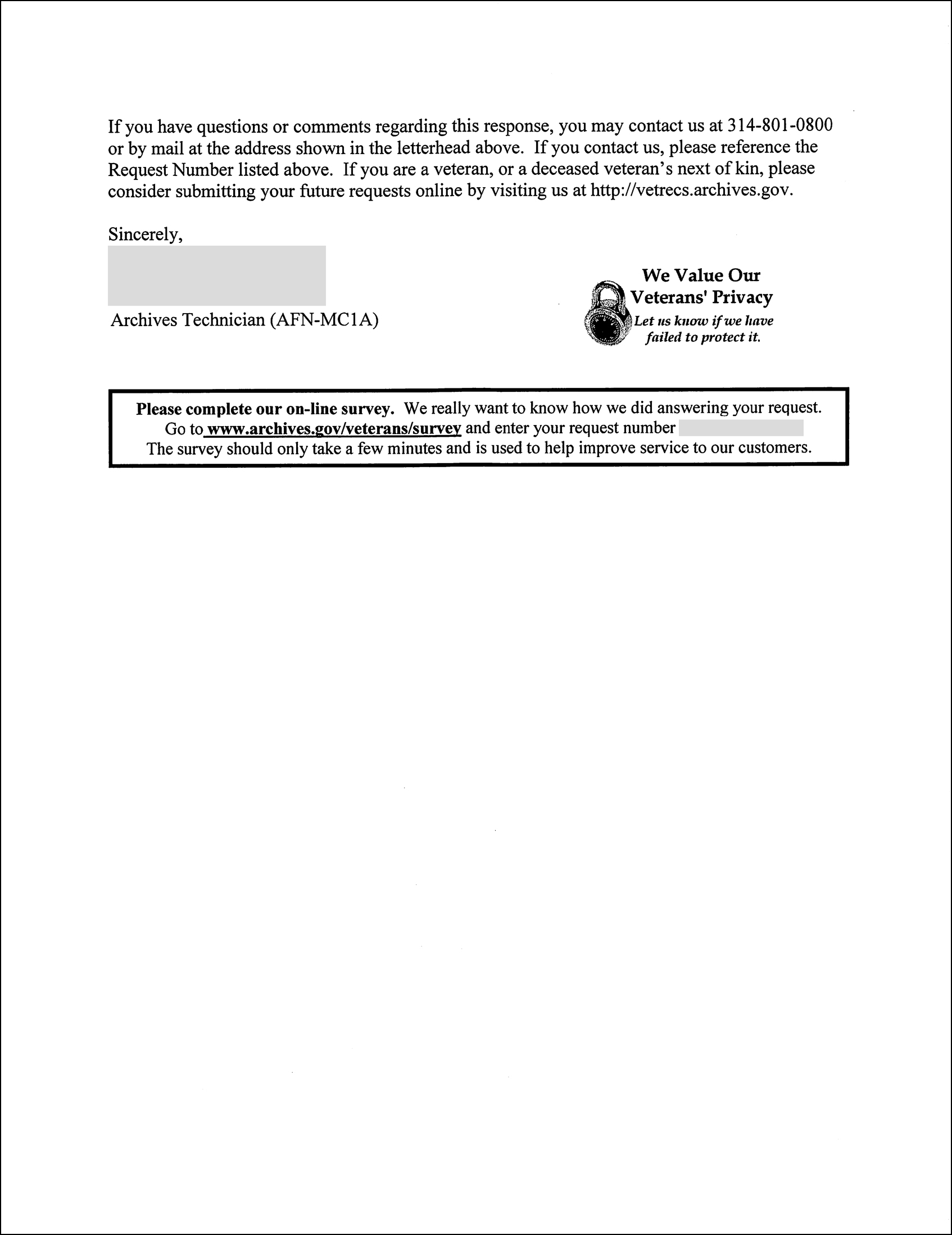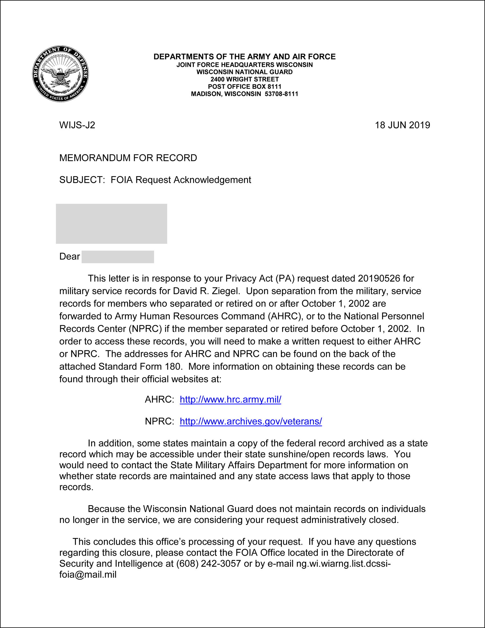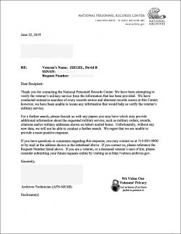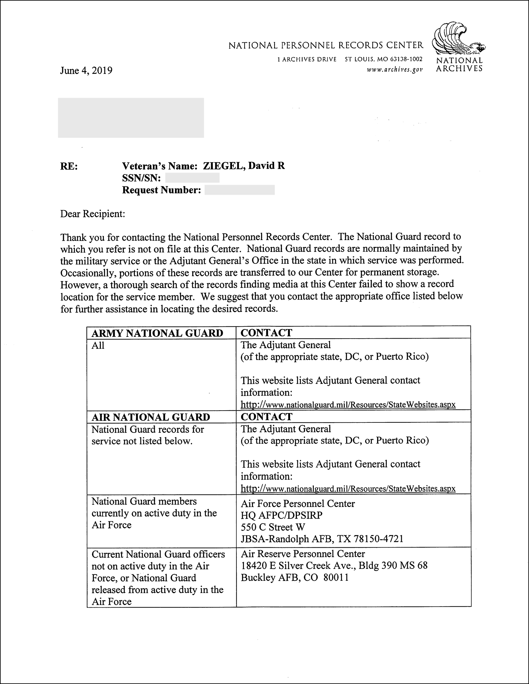 When filing a FOIA for the NPRC and the Wisconsin National Guard, they kept referring to each other in an endless loop. Six FOIAs were filed with the same result…