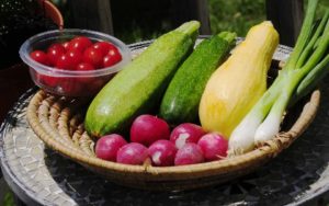 Onions, radishes, celery, zukes, shredded carrots, green peas, pickle relish (sweet or dill, your choice), dried herbs like dill or oregano, and then throw in some spicy mustard and mayonnaise. If you’re going to take it outside, keep it covered (of course) and put it on a bed of cracked ice. Otherwise, enjoy it, and be glad that we live where we do.