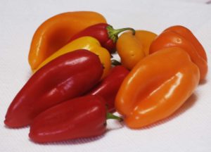 The color phase of bell peppers (orange, red, yellow) is easier on the stomach than the green phase. The skin is less tough. Just core them, get rid of all the seeds, and cut the peppers into pieces about an inch square.