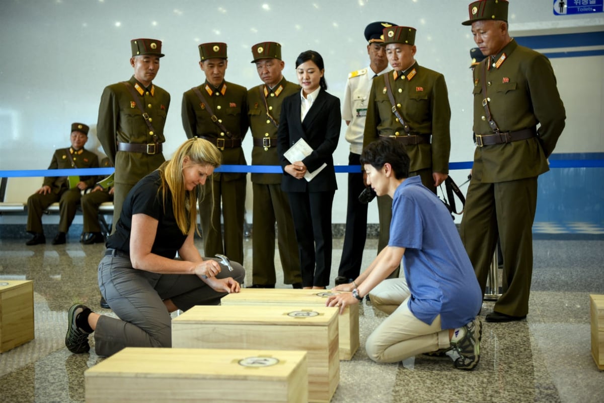 Defense POW/MIA Accounting Agency (DPAA) forensic anthropologist Jennie Jin, bottom right, secures one of the 55 cases of remains of service members turned over by the North Korean military as government officials observe on July 27, 2018. (Sgt. 1st Class David J. Marshall/Army)