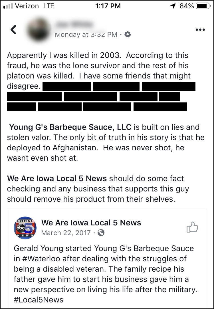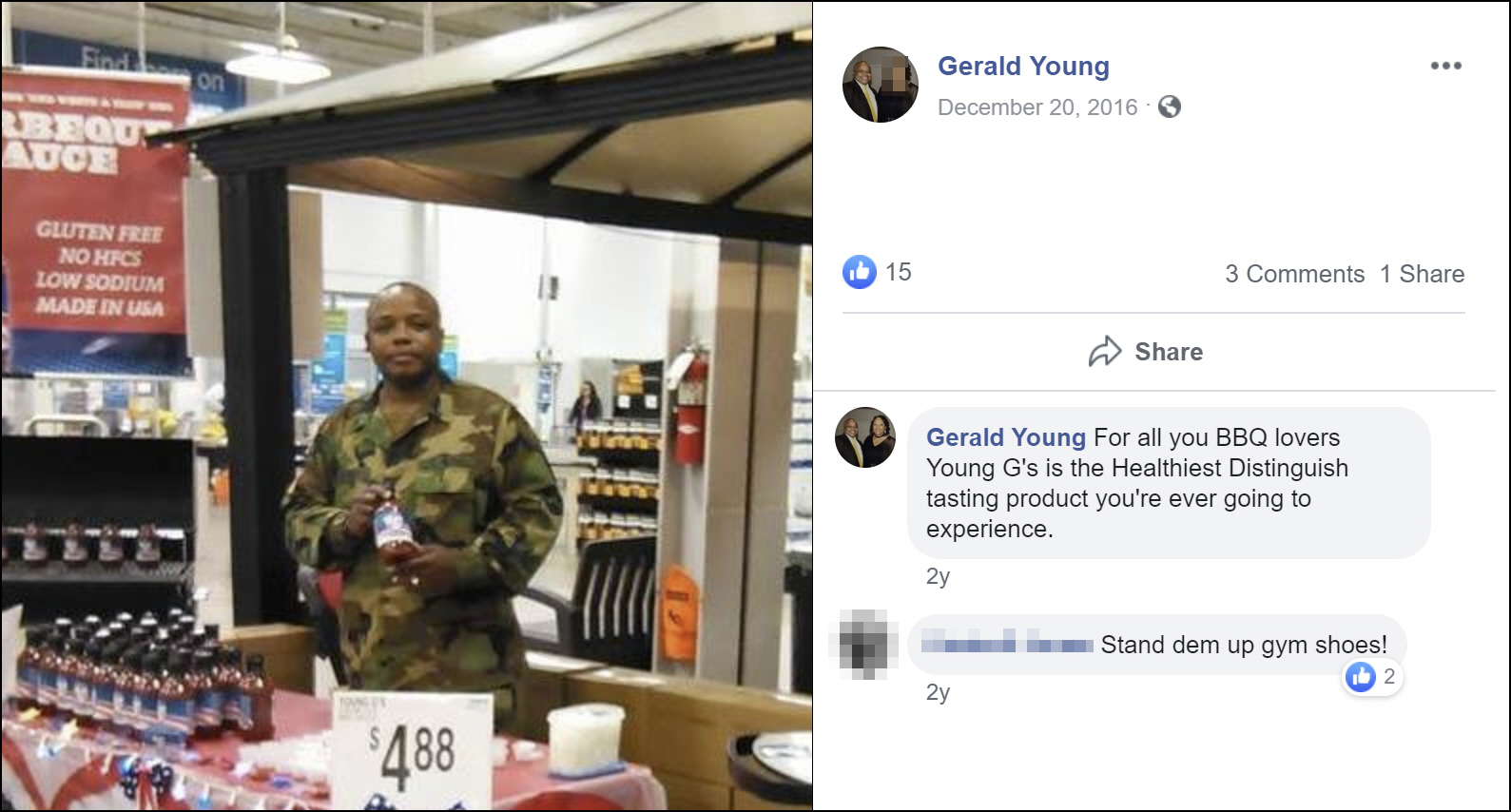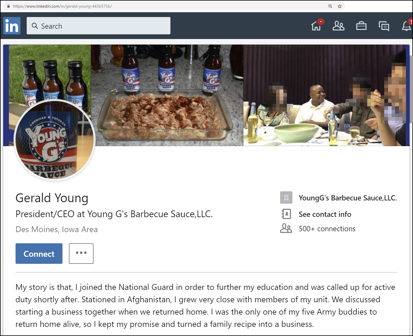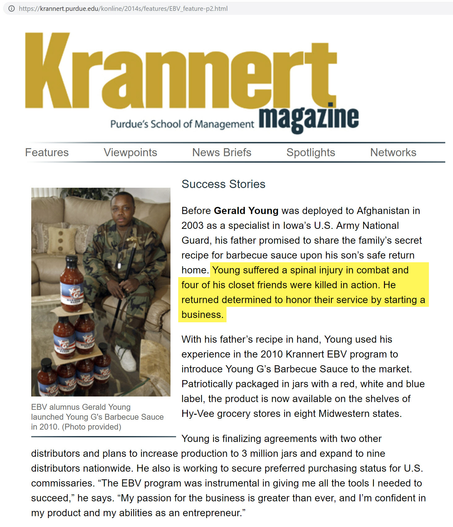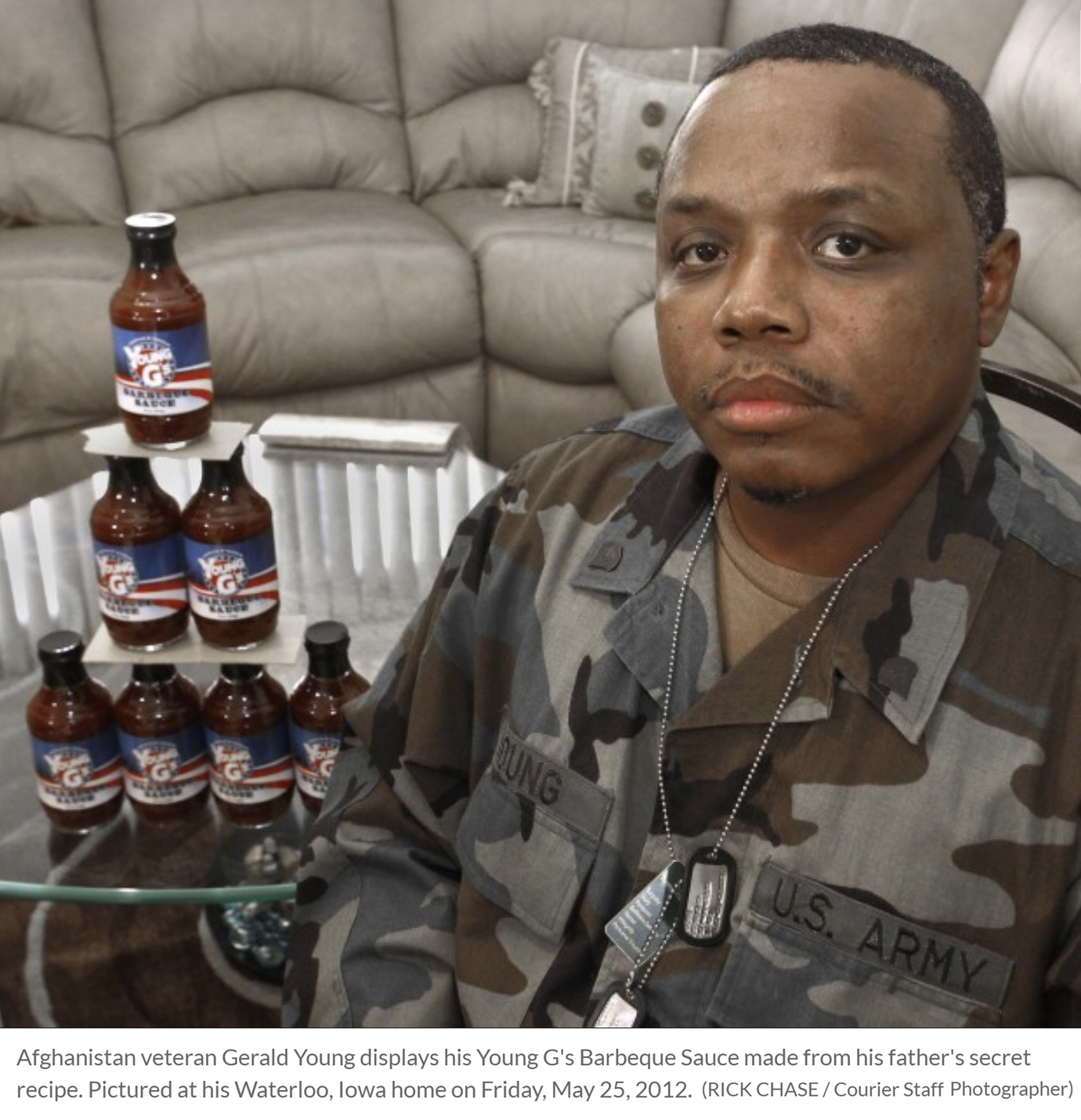 The folks at Military Phony send us their work on Gerald Donnell Young who served in Afghanistan with the National Guard. Gerald Young lives in the Des Moines area of Iowa and is 50 years old as of August 2019. Young claims that while in Afghanistan guarding a fuel depot, they came under attack and as a direct result of enemy fire he was “injured” and he was the only man out of five that survived. Young wanted to honor and remember his comrades, so what he came up with was to sell BBQ sauce.