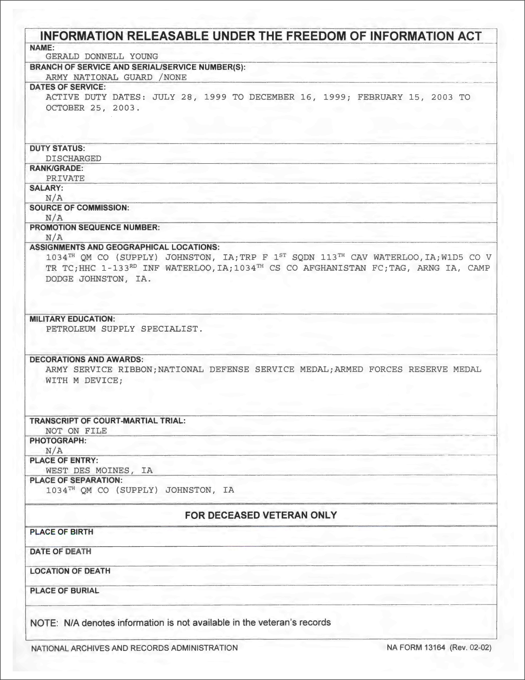 Gerald Young, phony sole survivor, discharged as a private, apparently has a criminal record. As mentioned below, he is deleting posts: