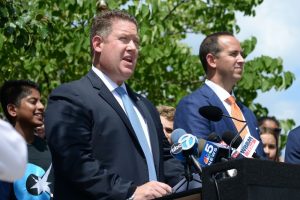 Lake County State’s Attorney Michael Nerheim speaks at a news conference on Aug. 13, 2019, at Daniel Wright Junior High School, Lincolnshire, Ill. (Victor Hilitski / for the Chicago Tribune)