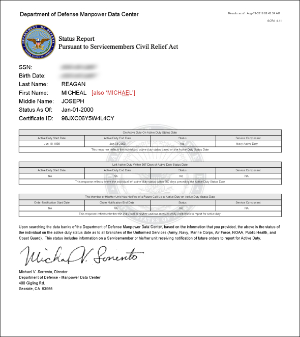 DEPARTMENT OF DEFENSE MANPOWER DATA CENTER (SCRA)