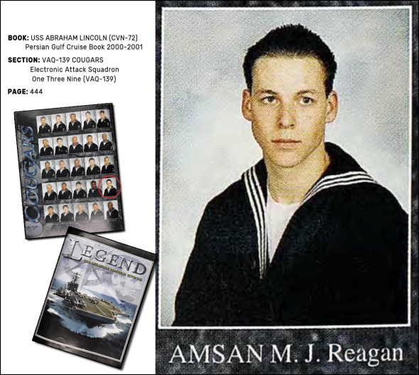 Michael Joseph Reagan’s official military records were ordered from the Department of the Navy via a Freedom of Information Act (FOIA) request. We looked through Navy cruise books to establish and confirm time lines of military service and contacted the senior enlisted that Michael Reagan served under. We also reached out to Michael Reagan and his wife to get their side of the story.