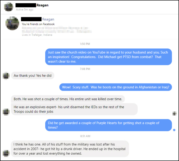 8. The wife of Michael Reagan, phony EOD, phony ground deployment, phony combat wounded, etc., member of Emmanuel Church near Indianapolis, Indiana, said this: