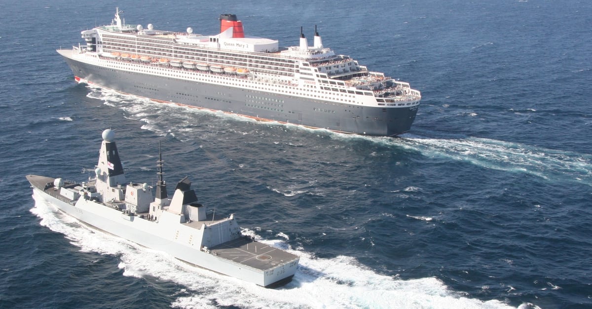 The Royal Navy’s Type 45 Daring-class air-defence destroyer Defender practices underway security with the Cunard Liner Queen Mary 2 in the Gulf of Oman on April 17, 2016. (Photo courtesy of Royal Navy)