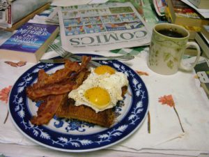 If that’s too much work, you can toast a couple of shredded wheat biscuits (the LARGE ones), fry up a couple of eggs and some bacon, put the eggs on the biscuits, and sit down with the morning news. Bon appetit!
