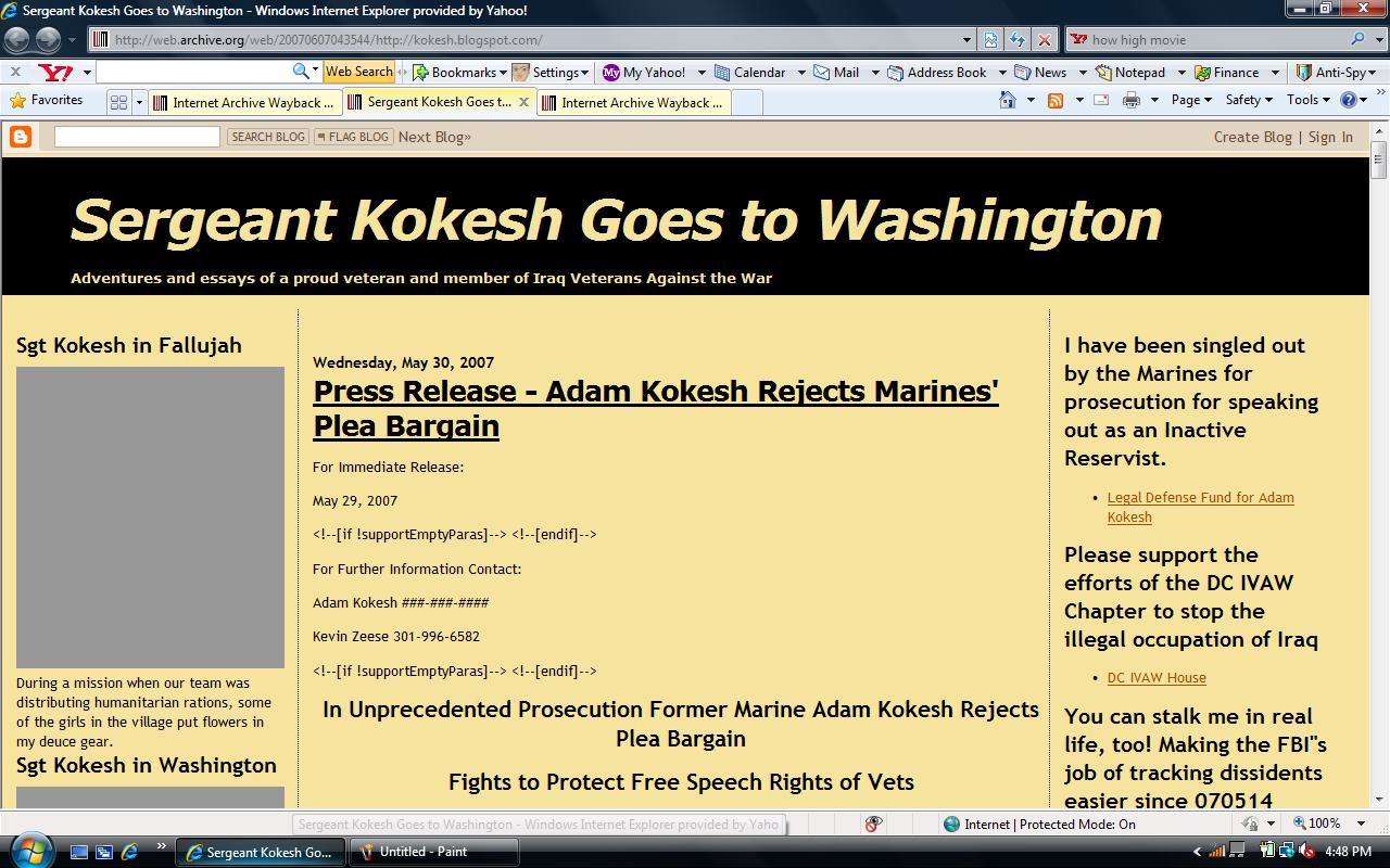 Well, Raoul reminded me yesterday of the exchange I had with Kokesh here last year about whether he’d ever called himself “Sergeant Kokesh” after he left the Marine Corp Reserves. So I chased down a cached copy of his old blog at the Wayback Machine;
