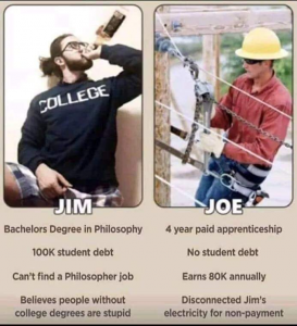 Some advice for anyone looking to get a college degree. Stick with business, law (includes paralegal which is what I’m studying), or anything that falls under STEM. That’s where you’ll find jobs if that’s the route you plan to take. Apprenticeships and vocational training are excellent routes to take as well (I actively encourage it because you not only can make good money but you can potentially operate your own business if you have the mind for it).