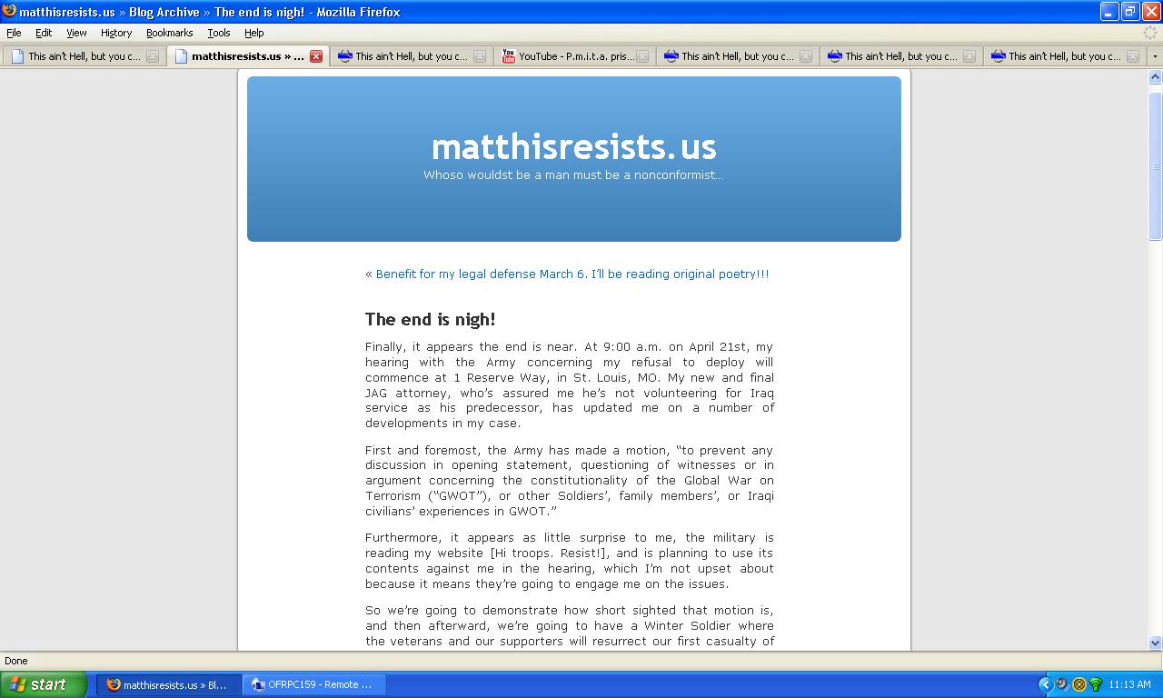 Furthermore, it appears as little surprise to me, the military is reading my website [Hi troops. Resist!], and is planning to use its contents against me in the hearing, which I’m not upset about because it means they’re going to engage me on the issues.