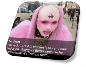 So someone please tell me, in regard to that very last image of the (???) in pink complaining about being unable to get a job, if she has any idea that she looks like a demented space alien on cannabis??