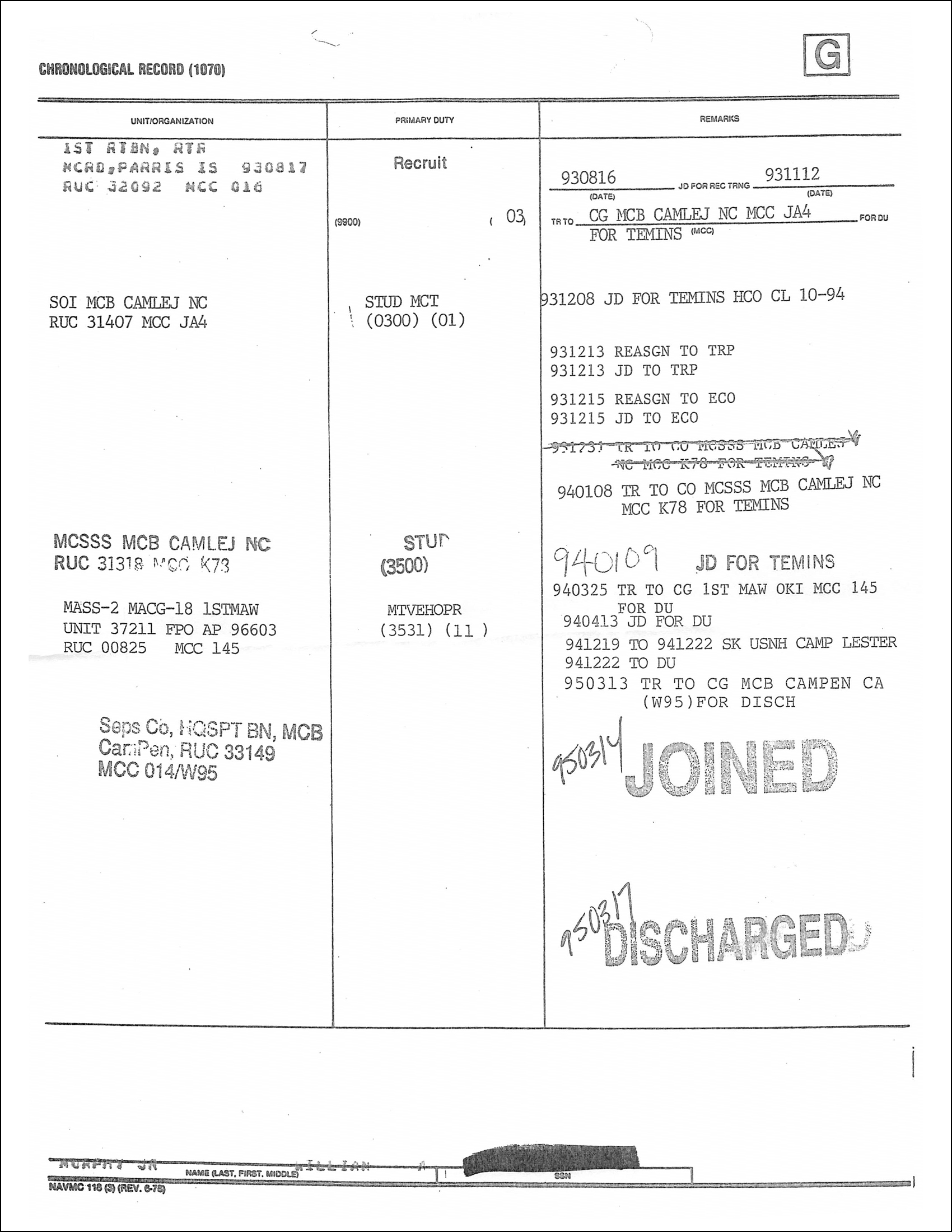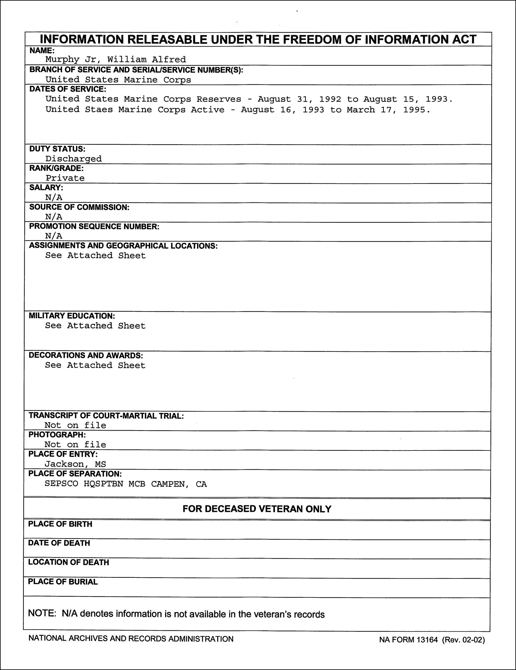 Murphy enlisted in the US Marine Corps and served from Aug 25, 1993 to Mar 31, 1995 was discharged as a Private (E-1). He claimed he made Corporal (E-4). Although the days vary slightly, the time frame of Aug 1993 to Mar 1995 is supported by both DoD Manpower Data Center and the FOIA results from NPRC.