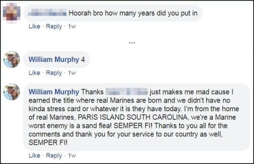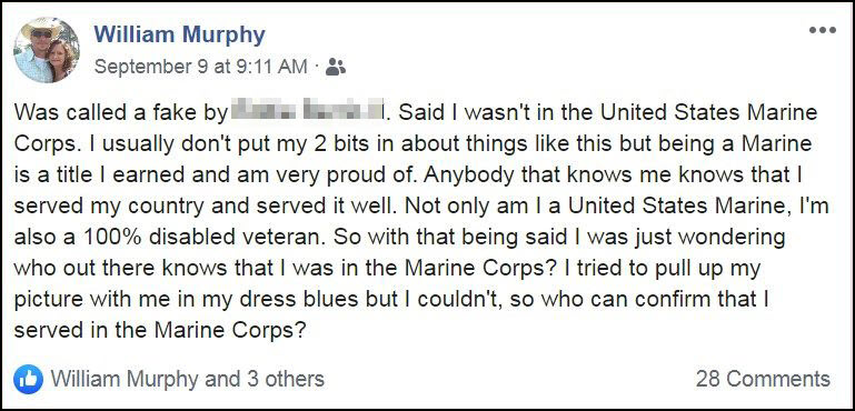Murphy proudly posts his photo of when he was back in the Marine Corps, and claims he is a 100% US Marine Corps disabled veteran.