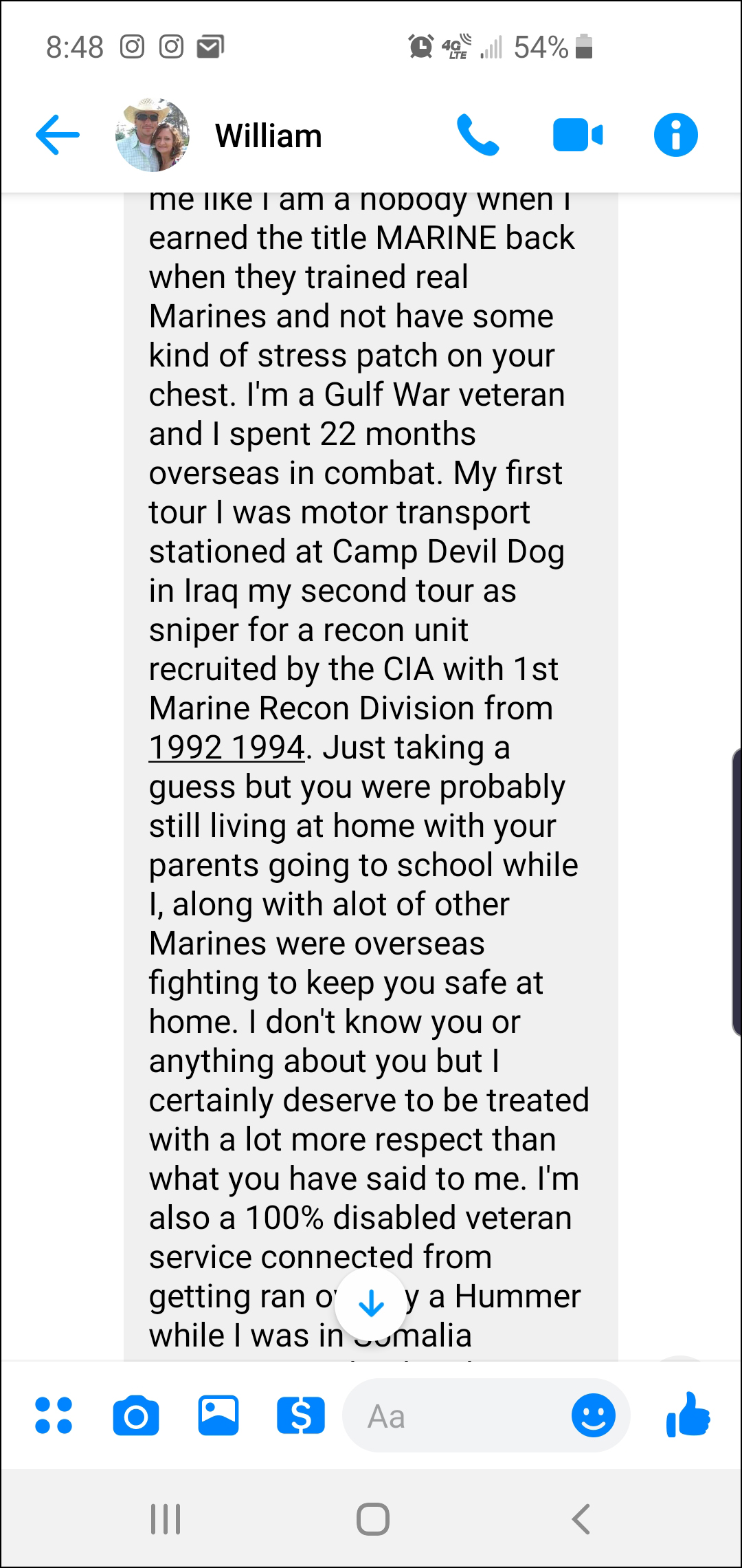 William Murphy: Better show me some GOD DAMN RESPECT, I got ran over by a hummer, oh and I was only stationed in Okinawa. Someone hacked me and ruined my career, but you better be humble with me!