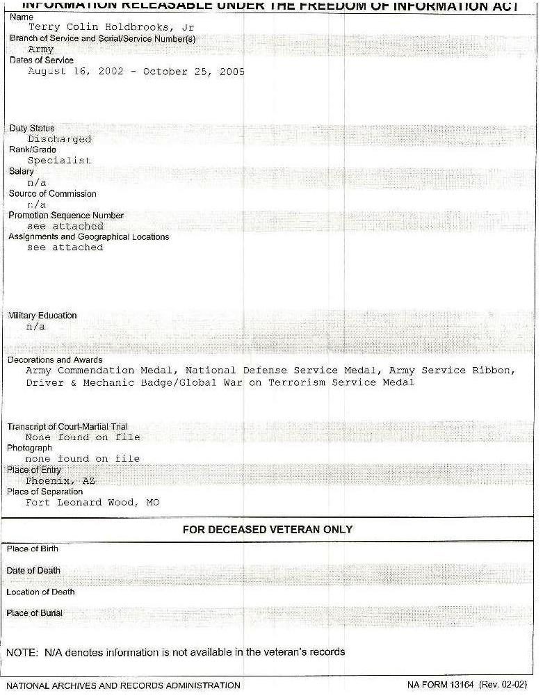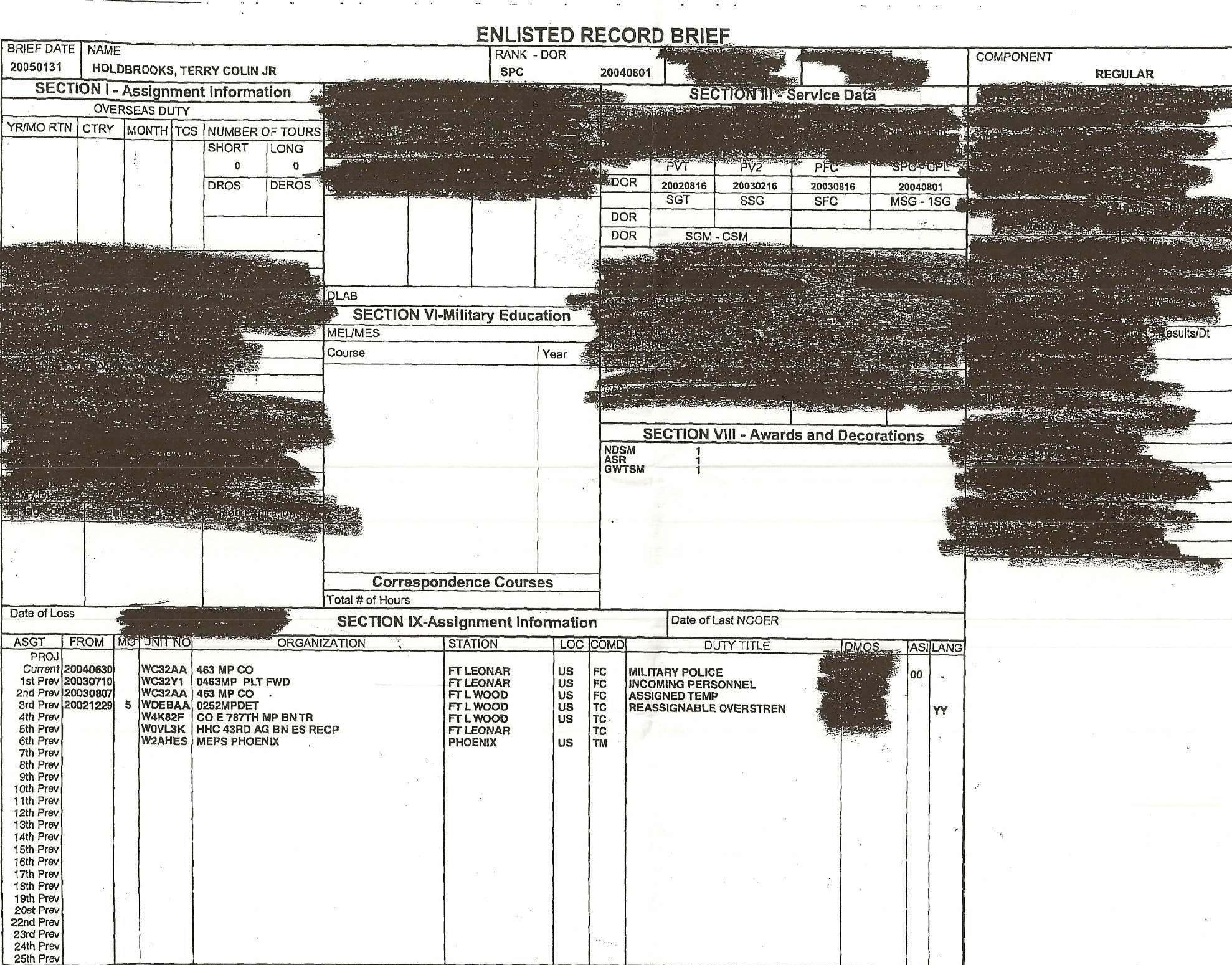 Olga sent me a recent article about Terry C. Holdbrooks who I wrote about last month in a post about Guantanamo guards. I wanted to check out his story so I asked the good folks at POW Net to get his records for us. Well, they came back and I know even less about him than I did before I asked for his records. He was in the 463rd MP company who were in Guantanamo during the period he claims he was there, but other than that his record is a big blank. Don’t believe me? Look for yourself – this how his Form 2-1 looked when I got it;