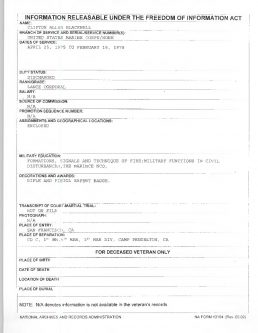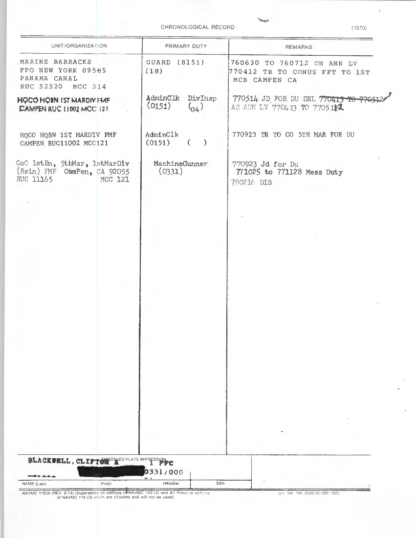 Looking at his record I see nothing that much out of Whack… Bit of Holding time after Boot to go to ITS, Then about A year of Barracks Duty, Then a short Stint as a Clerk ( Probably snatched up by HQ Bn when checking in) then finished out in 1/5.