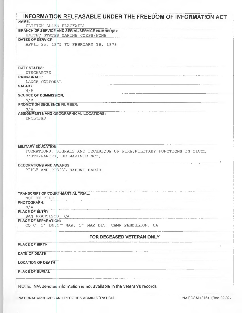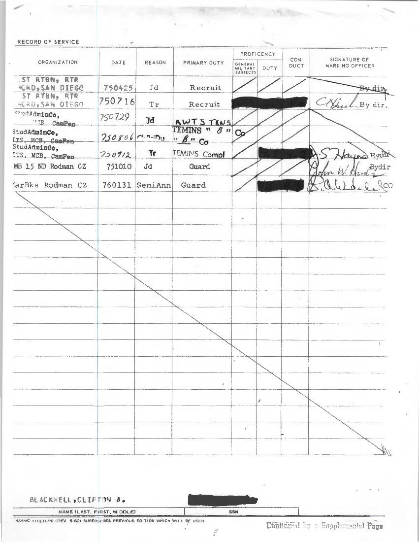 The National Personnel Records Center confirmed Clifton Blackwell’s service in the Marines from 1975 to 1978 in response to a request from The Associated Press. A Marines spokeswoman said earlier this week that a record of Blackwell’s service couldn’t be found.