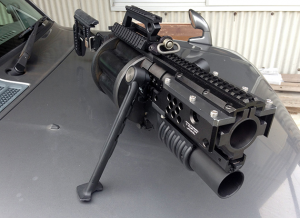 That thing on top of the car hood looks like an over/under 40MM launcher with a revolving cylinder under the handle/sight rail, so what’s it called