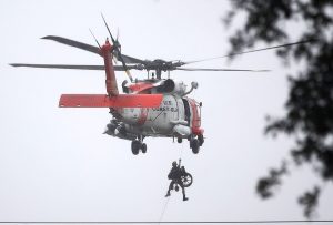 HOUSTON, TX – AUGUST 28: A Coast Guard helicopter hoists a wheel chair on board after lifting a person to safety from the area that was inundated with flooding from Hurricane Harvey on August 28, 2017 in Houston, Texas. Harvey, which made landfall north of Corpus Christi late Friday evening, is expected to dump upwards to 40 inches of rain in Texas over the next couple of days. (Photo by Joe Raedle/Getty Images)