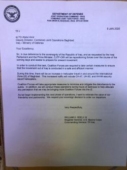 “Sir, in deference to the sovereignty of the Republic of Iraq, and as requested by the Iraqi Parliament and the Prime Minister, CJTF-OIR will be repositioning forces over the course of the coming days and weeks to prepare for onward movement,” read a letter from United States Marine Corps Brigadier General William H. Seely III, the commanding general of Task Force Iraq.