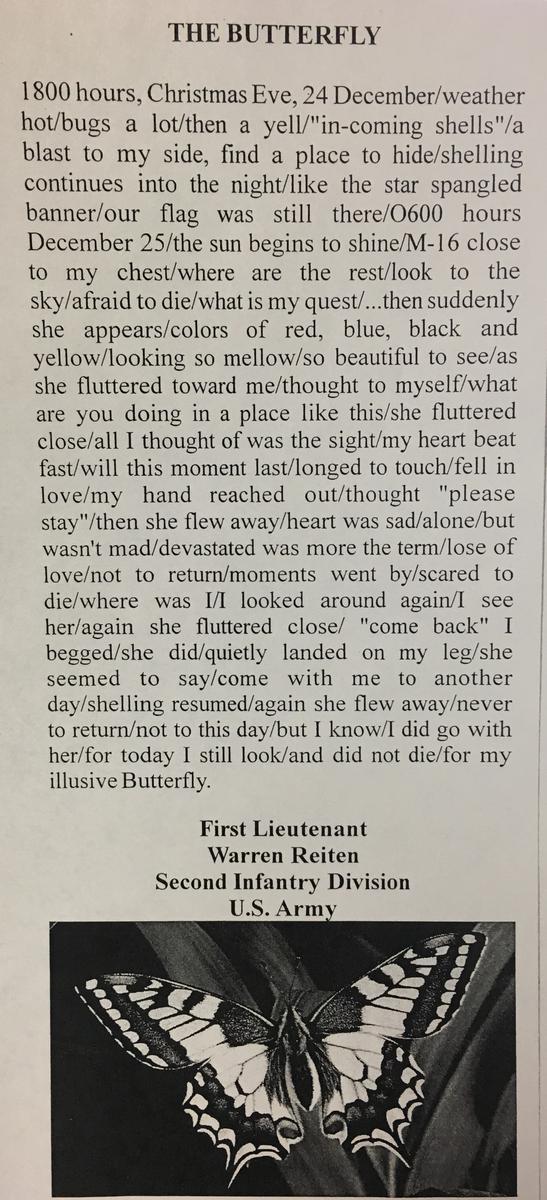 Warren claims he was a “US Army Second Lieutenant with the 2d Infantry Division from 1968-1970” (1:10-1:20), he was in Vietnam for a year “TDY on and off” (1:19-1:25), and stationed at “III (Three) Corps around South Central Highlands – Cu Chi” (1:25-1:34). Reiten confirms to the interviewer that he wrote: “The Butterfly” based on experience in the field (6:09-6:17).