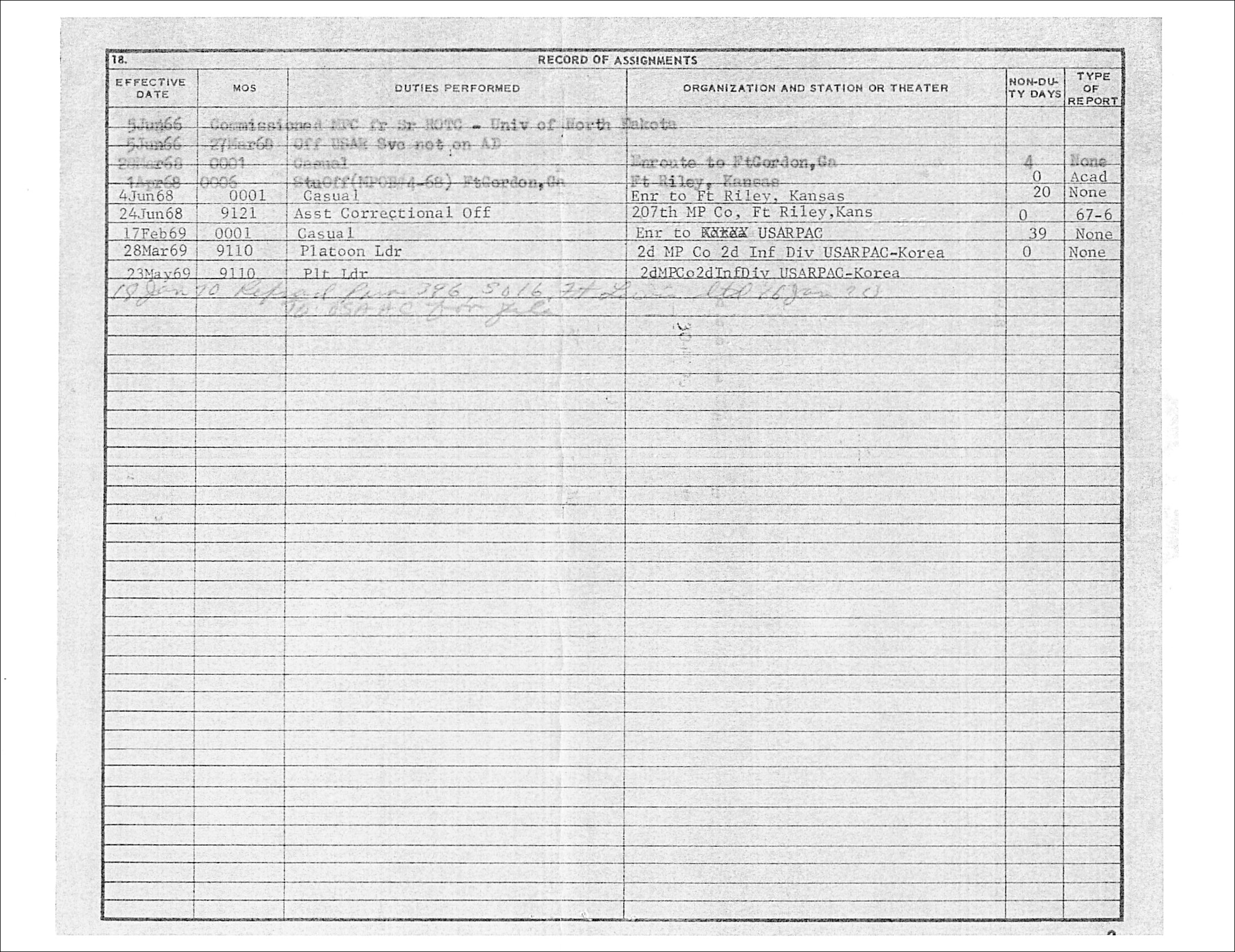 His official military records show that he was primarily assigned as an MP (Military Police).