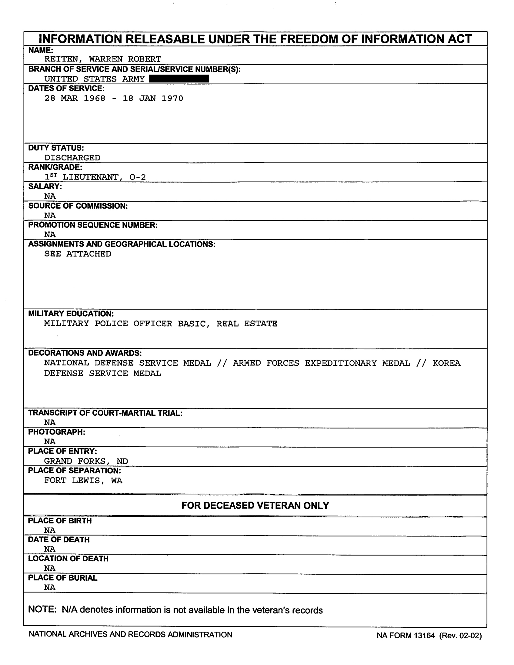 The kind folks at Military Phony send us their work on Warren Robert Reiten. Reiten is 76 years old at the time of this writing and lives in Fargo, North Dakota.