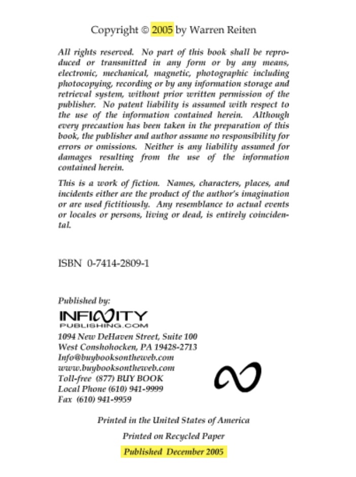 Warren Reitan’s 2005 book was published by Infinity Publications. They are a self-publisher; a publisher you pay to publish your books. You take your money and pay to have the book published, and hope you make a profit on your book sales.