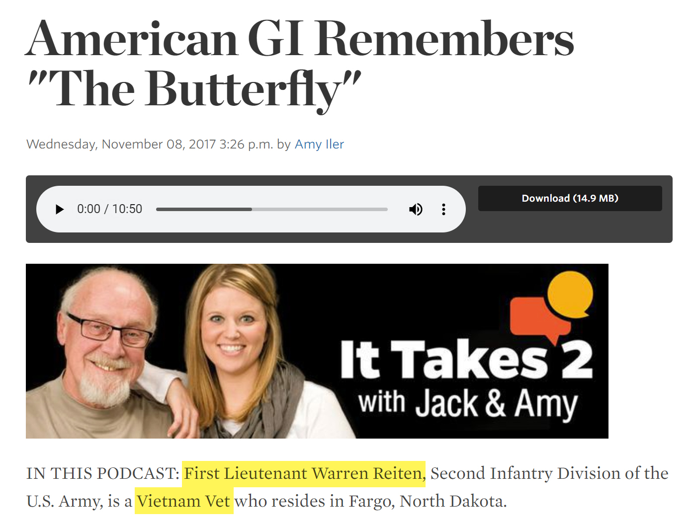 In 2017, a few years after the Salvation Army promotional video, Reiten did a radio interview and podcast called “American G.I. Remembers the Butterfly” for It Takes 2 with Jack & Amy.