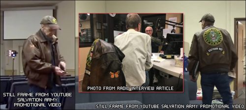When video still frames from the 215 Salvation Army promotional video are combined with a photo from the 2017 podcast/article, the jacket appears to be the same one with the butterfly on the right shoulder/sleeve.