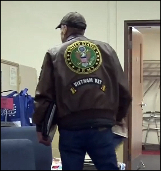 A few seconds later in the video, Reiten turns and you can clearly see “VIETNAM VET” on the back of his leather jacket.