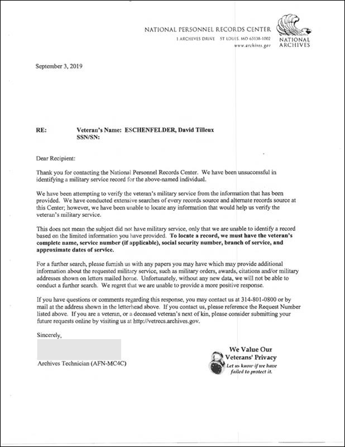 The NPRC was contacted to get Eschenfelder’s military records and they provided this after conducting a search: