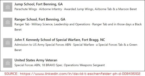 Hold on, pump the brakes. Photographic evidence has emerged that David Eschenfelder WAS in Special Forces. In his 1973 High School yearbook when he was a Junior, he is listed with the Drill Team as a Special Forces medic.