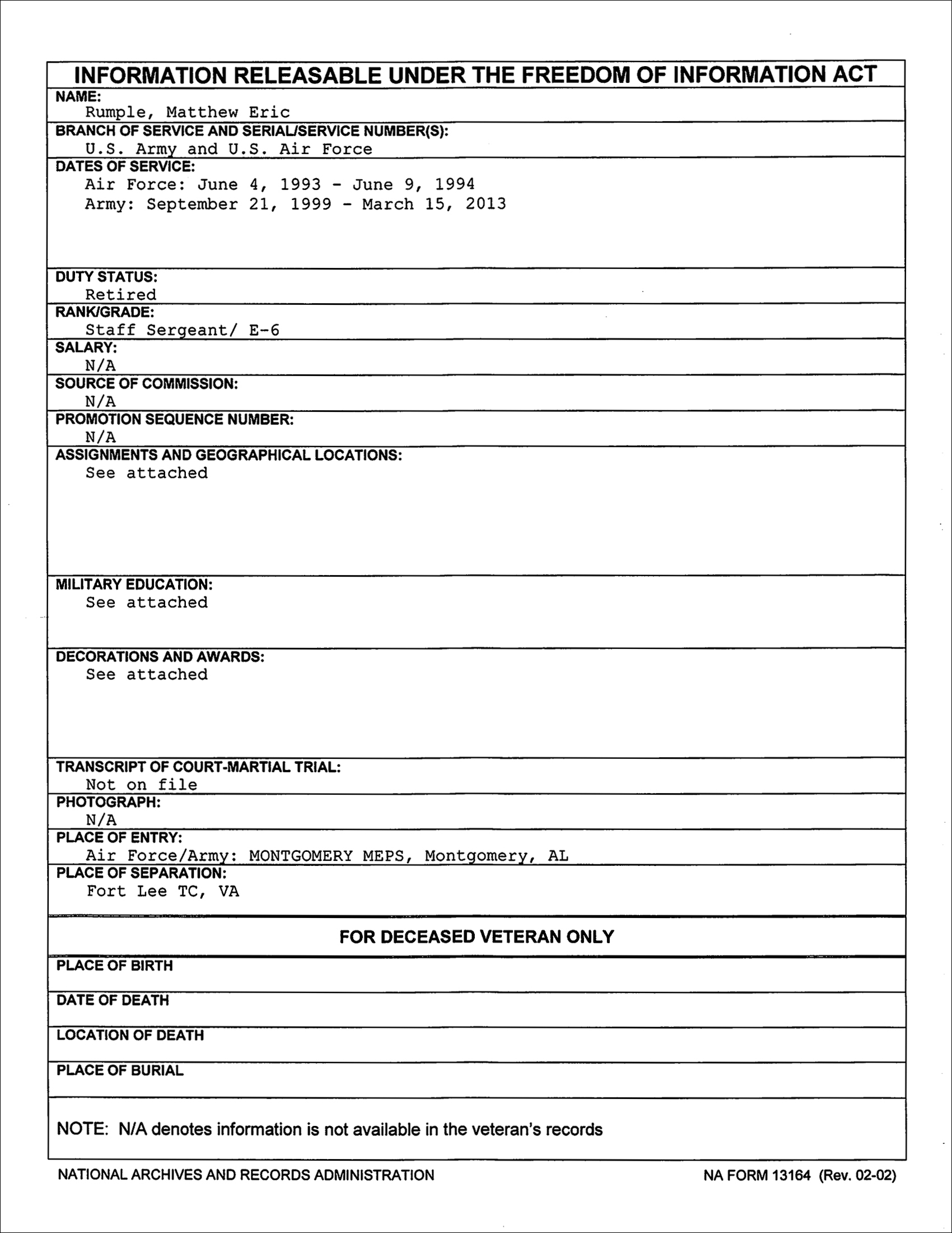 Rumple was in the USAF for a little over one year. He was in the Army for 13.5 years according to the NRPC Summary Sheet, but according to the DoD Manpower Data Center service dates, it was 14.5 years so we suspect a typo on the NPRC Summary Sheet. Even still, Rumple was in either 14.5 or 15.5 years and this is different than the 21 years claimed.