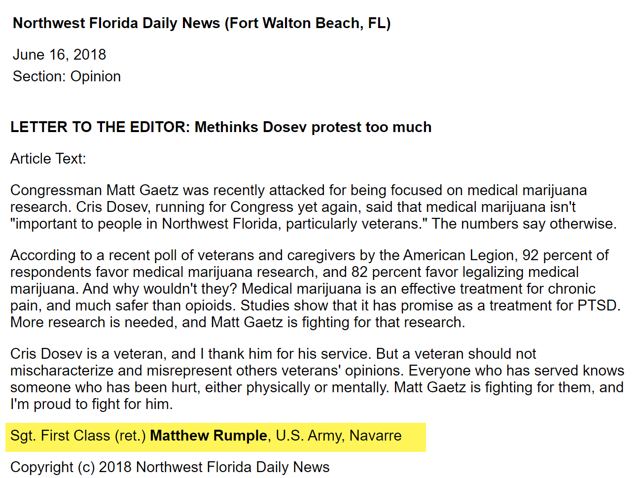In the following article Rumple writes in to weigh in on the topic of medical marijuana. This is 2018, which is five (5) years after Rumple was discharged. Note that he signs it Sgt. First Class (ret.). The official Army abbreviation for this is SFC which is an E-7.