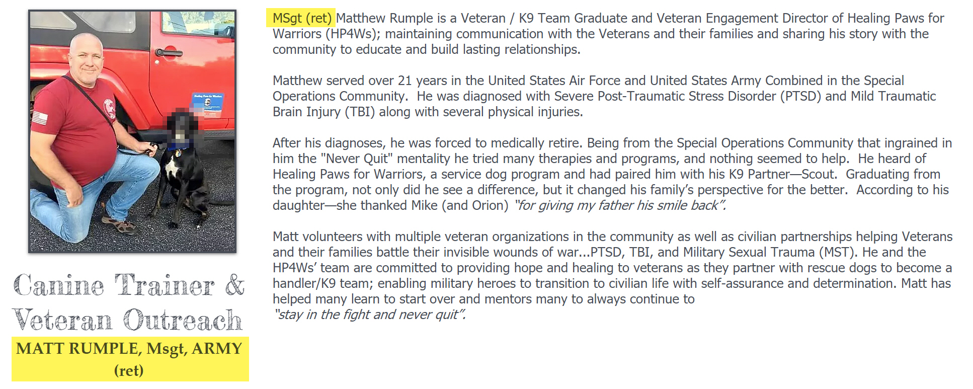 Rumple, who has the nickname “Punisher,” works for Healing Paws for Warriors. On their website under Rumple’s biography it claims he is a retired Master Sergeant (MSG – E-8) and “served over 21 years in the United States Air Force and United States Army Combined in the Special Operations Community.”