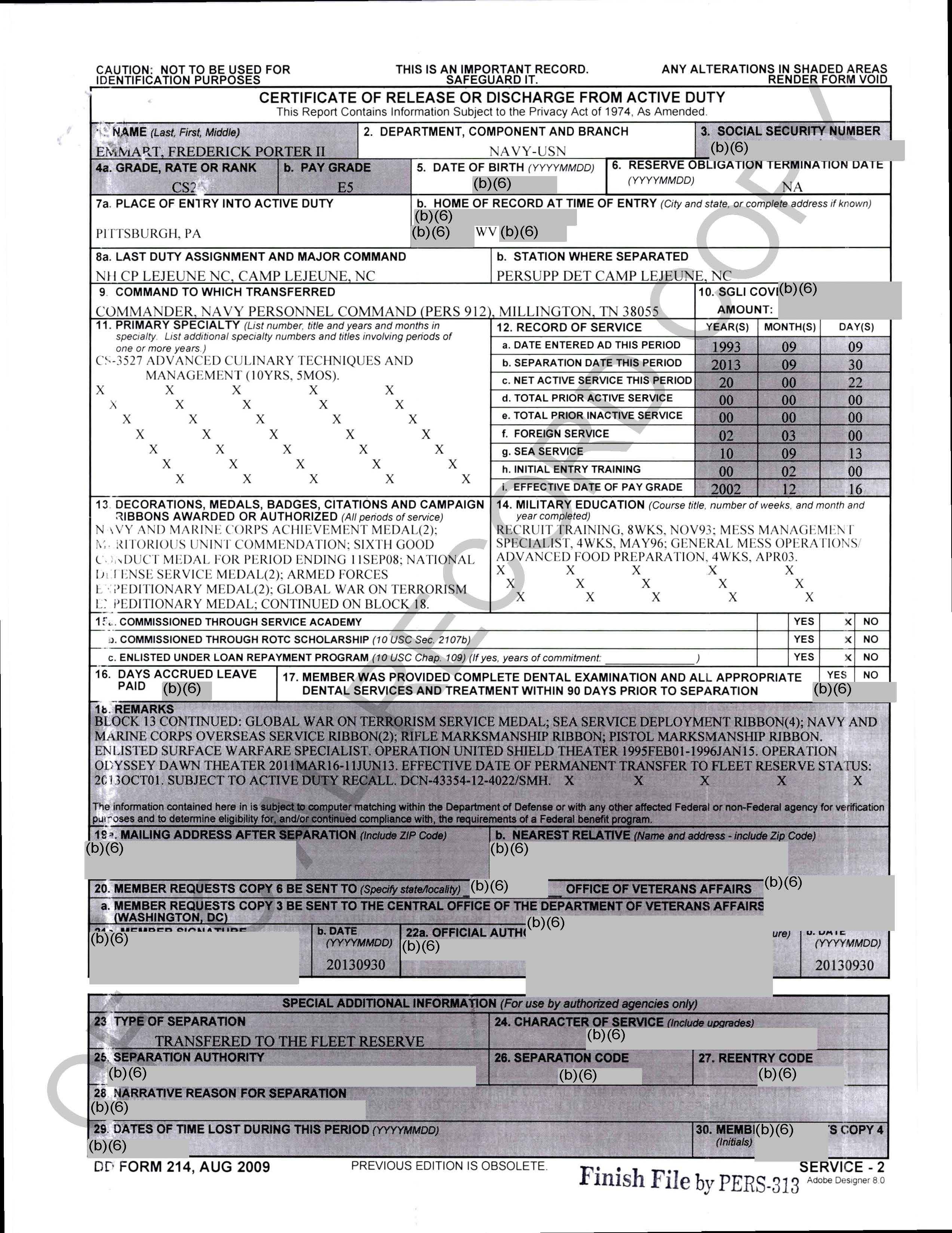 The records show that Fred Emmart served in the US Navy from 1993 to 2013. He was discharged as a Culinary Specialist Second Class (E-5).