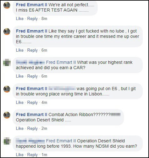 Emmart was asked about his rank and if he was in combat. He said he received a Combat Action Ribbon (CAR) for Operation Desert Shield. Besides ODS/S being before he enlisted in 1993, the “combat” part of that operation was called “Storm” and not “Shield.” He was honest about his rank and said E-5 vs. E-6 but felt he was so close to E-6. Recall it is claimed as PO1 (E-6) on his Facebook profile.