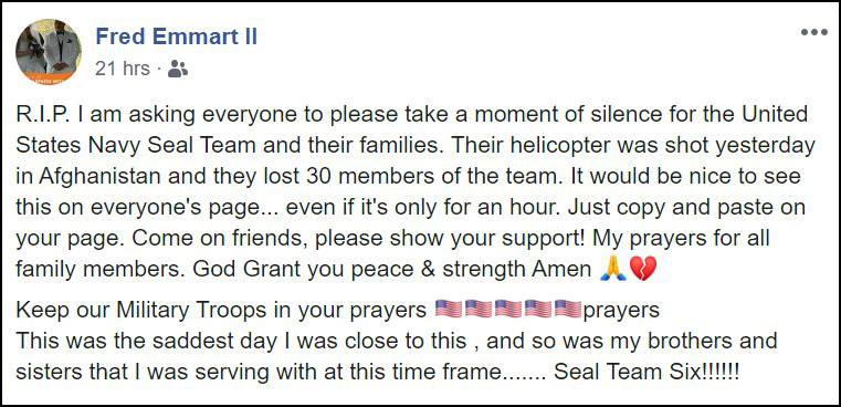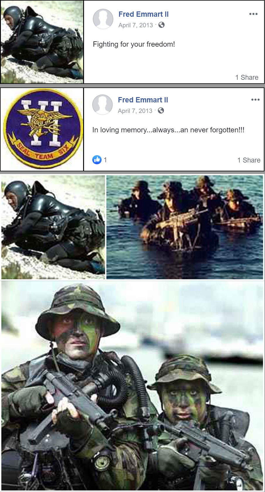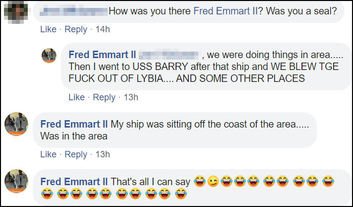 Emmart has photos and comments posted that gives the implication that there is a strong connection with himself and the US Navy SEAL community.