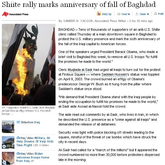 I guess Shi’ite cleric Mooky al Sadr is sad that Sadam Hussein’s government fell six years ago today since he and his acolytes were out in force to protest the event by burning George W. Bush in effigy;