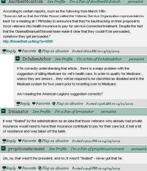 In the comments section of that article, a HuffPo reader reminds Reickhoff that Obama had to be dragged kicking and screaming into caring for veterans with this link to our post last month. Initially, the administration had planned on funding our health care on the backs of veterans and their insurance companies. But then they discovered how big of a voice veterans have in this country.